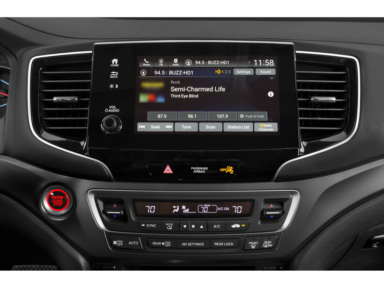- Radio: 215-Watt Audio System -inc: 7 speakers, subwoofer, Bluetooth® HandsFreeLink and streaming audio, MP3/auxiliary input jack, Radio Data System (RDS), Speed-sensitive Volume Compensation (SVC), 2.5-amp USB charging port (1 port in center console/2 ports on 2nd-row), 8" display audio w/high-resolution touch-screen and customizable feature settings, HondaLink, CabinControl remote compatibility, Apple CarPlay integration, Android Auto integration, SMS text message function, SiriusXM (SiriusXM requires a subscription after any trial period, If you decide to continue your SiriusXM service at the end of your trial subscription, the plan you choose will automatically renew and bill at then-current rates until you call SiriusXM at 1-866-635-2349 to cancel, See our customer agreement for complete terms at www.siriusxm.com, Fees and programming subject to change, Available in the 48 contiguous United States and D.C, SiriusXM and all related marks and logos are trademarks of SiriusXM Radio Inc.), HD radio, 2.5-amp USB smartphone/audio interface (1 port in front console) and wireless phone charger